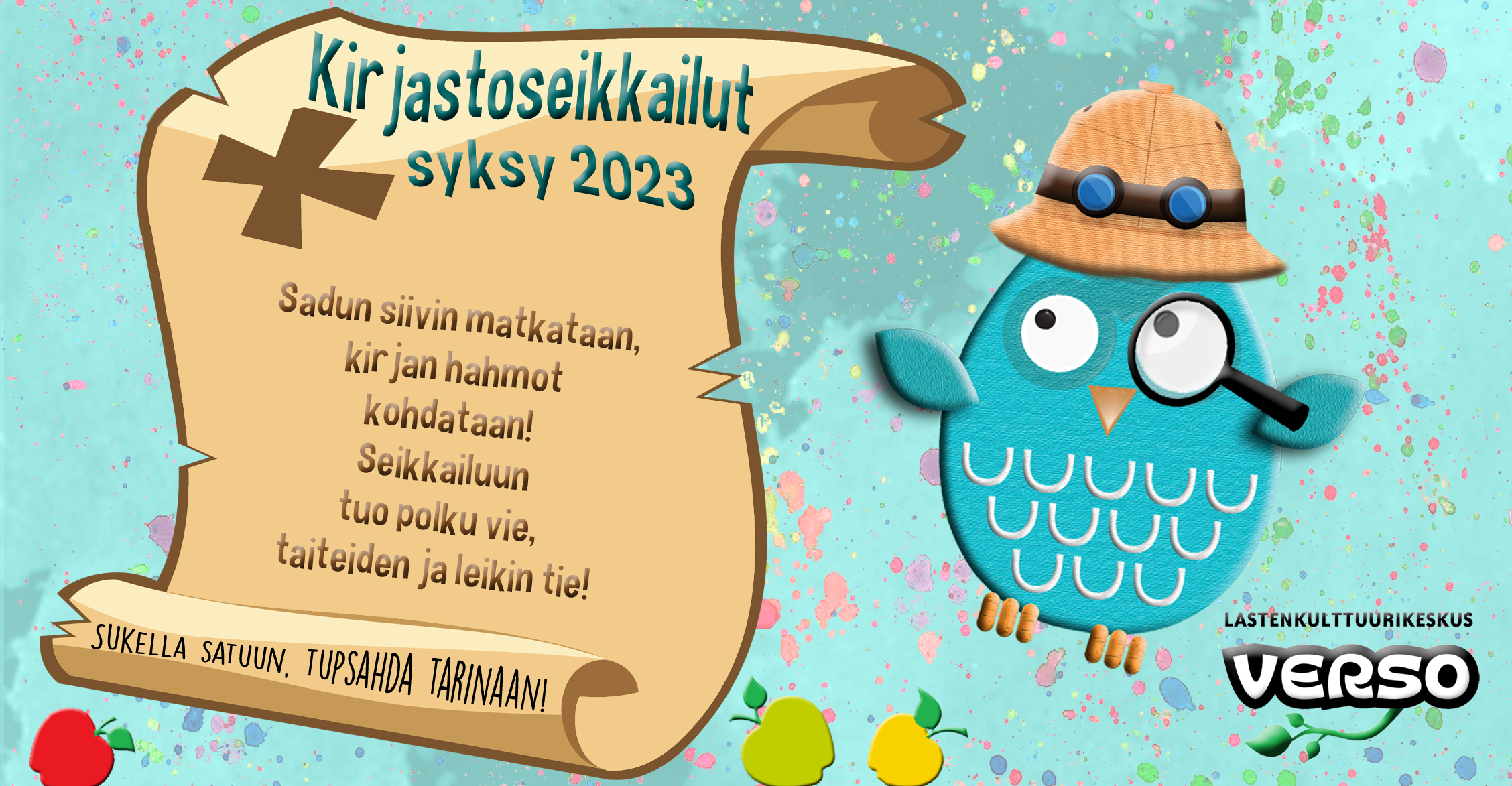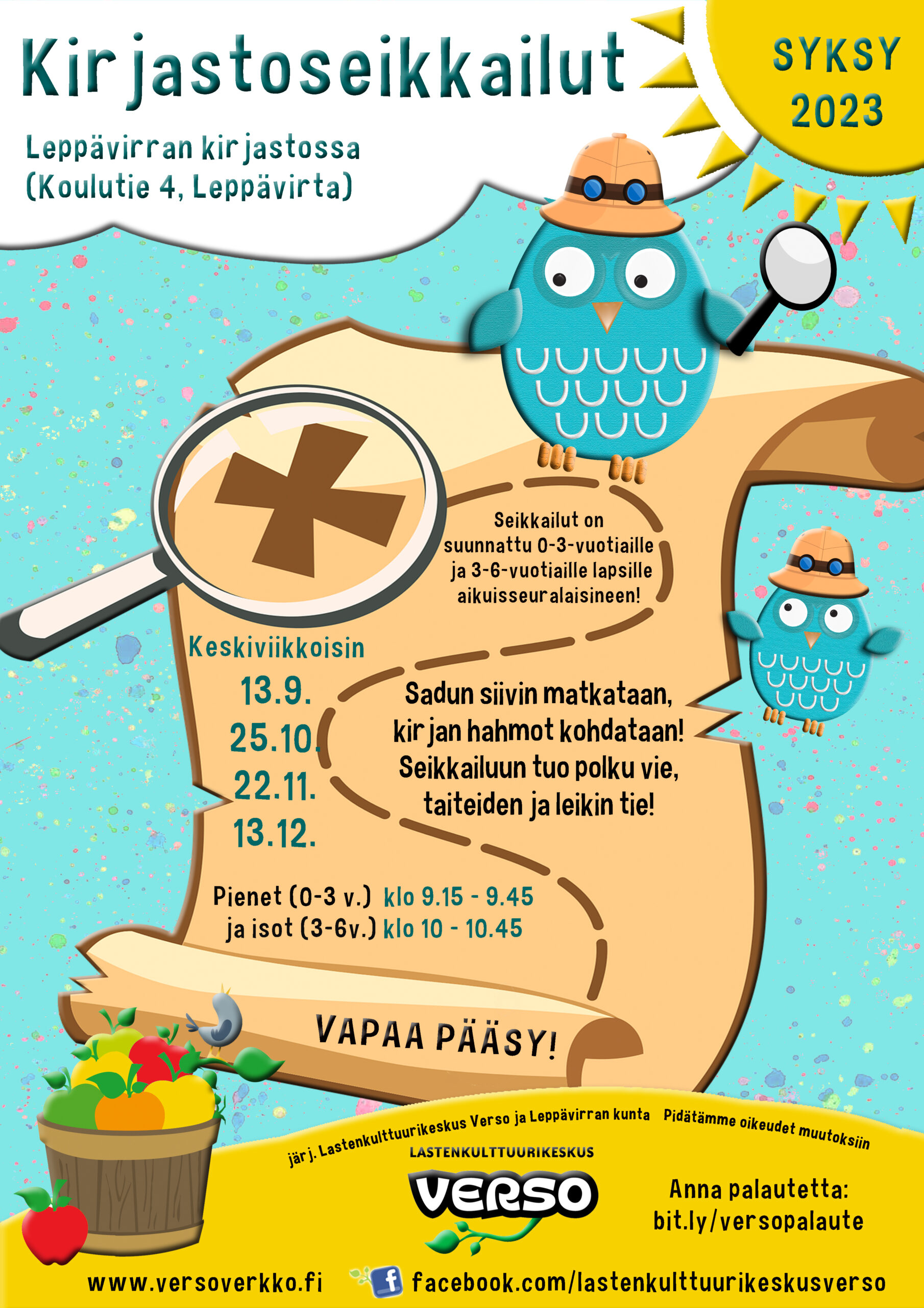 Tässä esimerkissä on Lastenkulttuurikeskus Verson Leppävirran syksyn 2023 Kirjastoseikkailujen juliste, televisionäyttökuva,Facebook-tapahtumakuva ja Instagram-kuva. Ne kaikki poikkeavat toisistaan, mutta liittyvät kuitenkin selvästi samaan asiaan.